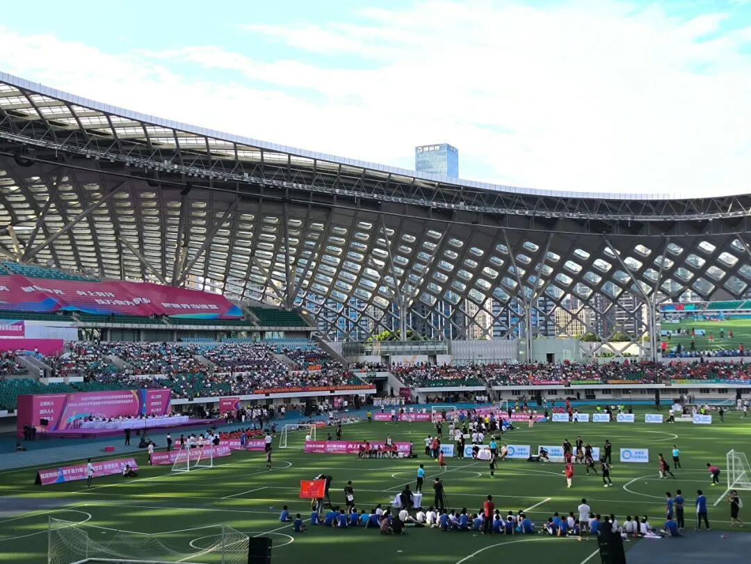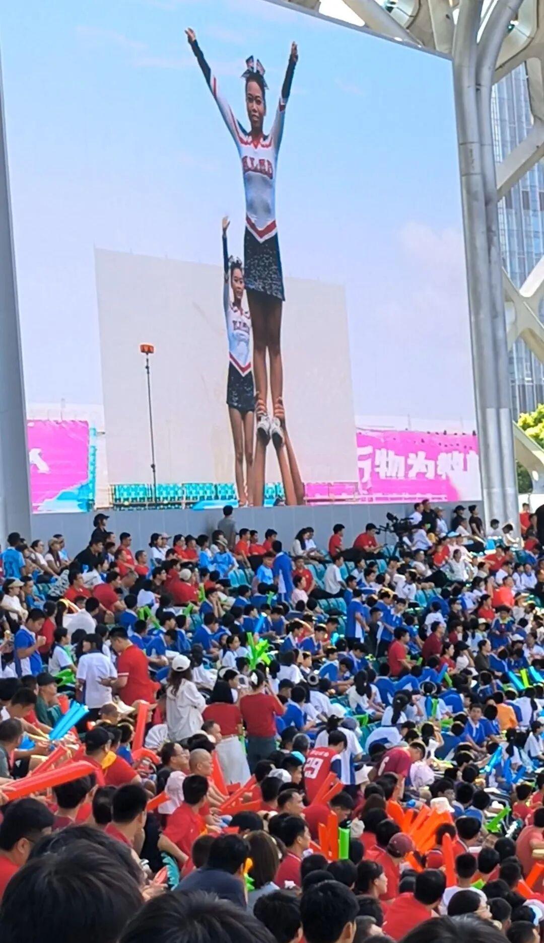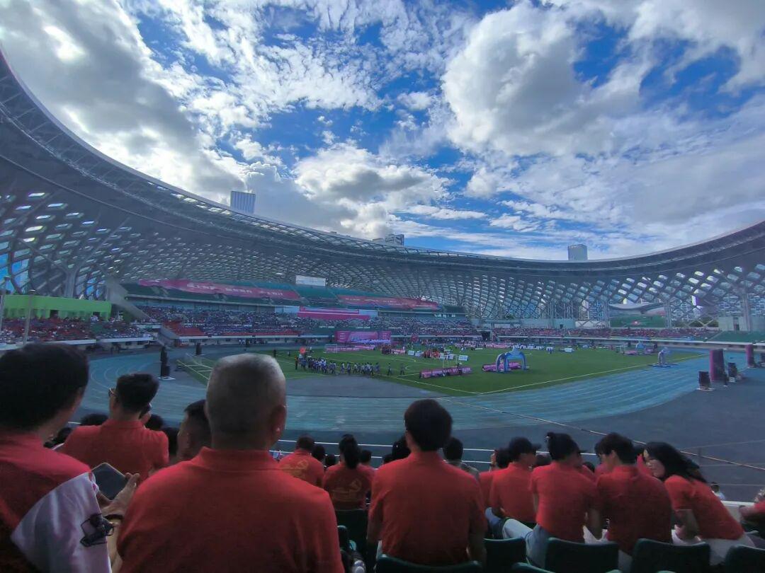 当天为多云天气,蓝天白云下清风送爽,由教师、家长和学生共同组成的“亲友团”从全市各区奔赴“春茧”体育馆为孩子们加油。红色、蓝色、白色……“亲友团”穿着跟比赛队伍同色的衣服,分区域整齐落座。“亲友团”甚至还都备上了蒙皮大鼓和彩色的应援棒,在比赛的关键时刻颇显“狂野”地擂出令人血脉偾张的鼓声,同时大家纷纷挥舞应援棒,高声呐喊,为孩子们加油。