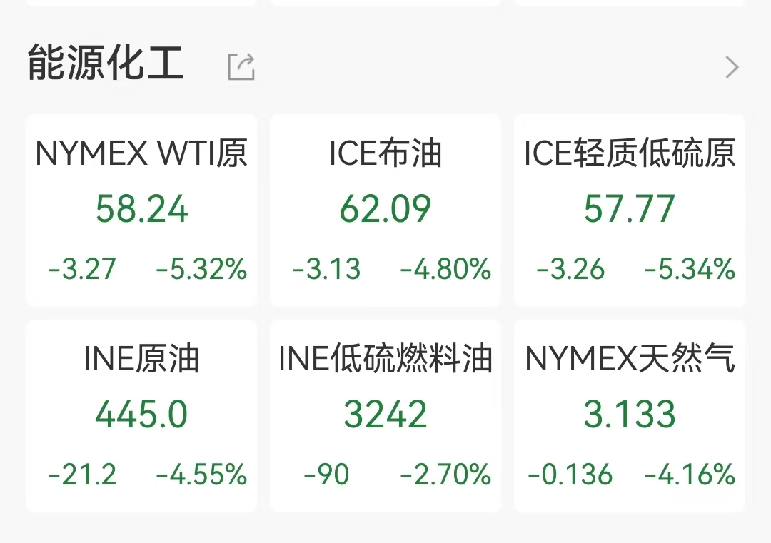 国际油价全线收跌,美油主力合约跌5.32%报58.24美元/桶,周跌4.34%;布油主力合约跌4.75%报62.12美元/桶,周跌3.73%。